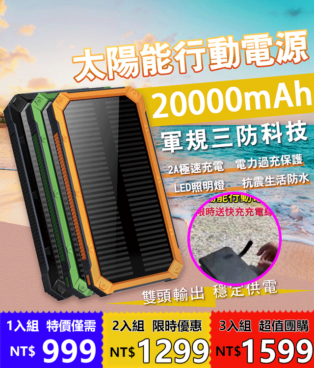 7分鐘前太陽能行動電源 - 【團購優惠】太陽能行動電源3入組僅需-NT$ 1599